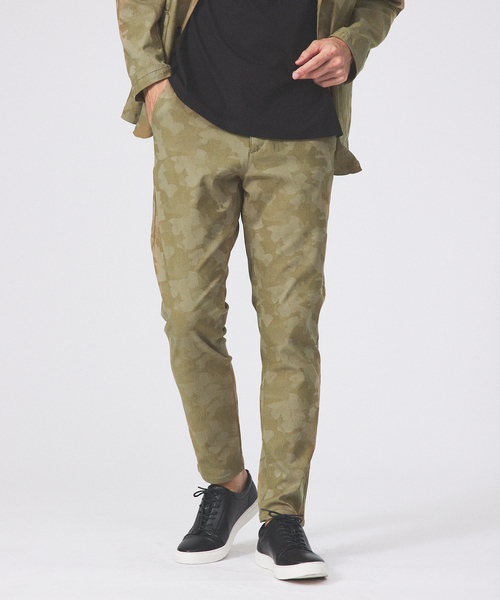 さり気ないカモフラ柄+ストレッチでゴルフも◎【素材】高反発、高ストレッチ素材で、程良いハリ感のある生地を使用したノンストレスな素材です。さり気ないカモフラジャガードを施した目をひく個性的な素材になっています。【デザイン】ひざ下から裾にかけたテーパードラインは、美脚効果抜群。ウエスト周りをゴム仕様、ドローコード仕様にすることで腰位置の調整も可能です。ポロシャツや襟付きのトップスと合わせてゴルフウェアとしての使用もOKです。【コーディネート】シャツやポロシャツなどの大人アイテム合わせはもちろん、Tシャツ合わせのカジュアルコーデでも品良く着用いただけます。同素材ジャケット(71469780301)とのセットアップスタイルの着こなしや同素材ショーツ(71469751301)もオススメです。