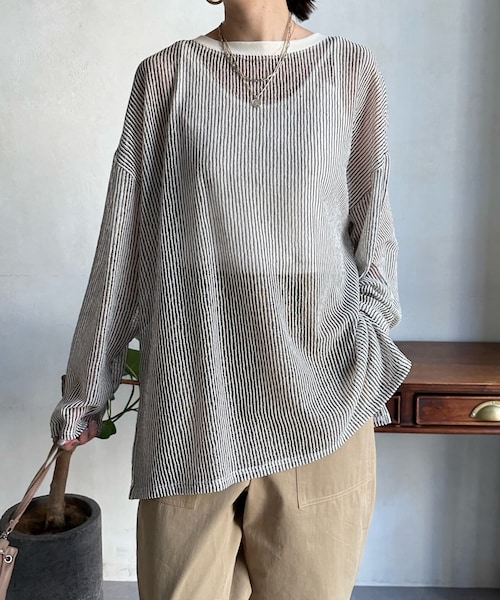 ■2023 SPRING & SUMMER ITEM■さり気ないストライプがおしゃれさを引き立てる!トレンドライクなシアーロンT。細かなストライプ柄で、他との差をつけてくれる1枚です。素材感はさらりと薄手、ゆるっとややルーズなサイジング。抜け感たっぷりの印象を与えます。程よい透け感が大人らしく、上品に決まるのでカジュアルになりすぎないのがポイントです。ロンTからキャミまで幅広くレイヤードスタイルを楽しんでいただけるので、春夏のおしゃれを格上げしてくれること間違いなし!- POINT -・トレンドライクなシアー素材・細かなストライプ柄がポイント・レイヤードスタイルを楽しめる!--------------------------------洗濯:手洗い可能透け感: あり裏地: なし伸縮性: ややあり光沢感: なし--------------------------------【 ♡ をクリックでお得な情報をお知らせいたします 】〈 商品のお気に入り登録 〉 お気に入りアイテムのお値下げ・再入荷・在庫ラスト1点など通知を受けることができます。〈 ブランドのお気に入り登録 〉DOUDOUの新商品や再入荷、セール、クーポン配布などお得な情報を受けることができます。--------------------------------------※ 生産の都合上、お届け時期が前後する場合がございます。※ 掲載画像の商品の色味は、 撮影場所や光の当たり具合などにより色味が異なって見える場合がございます。 また、お客様のお使いのPC・スマートフォン等のモニター環境などにより色味が異なって見える場合がございます。予めご了承の上ご注文ください。 ※ 着用、お取り扱いの際は、商品についている品質表示とアテンションタグを必ずご確認下さい。