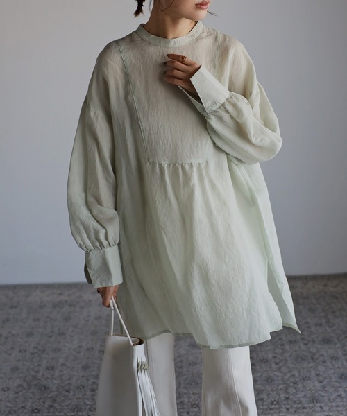 ブザム切り替えのチュニック丈シアーシャツクラシックなブザム切り替えがこなれた印象の大人のプルオーバーブラウス。程よい透け感で、縦に筋が入った涼しげでナチュラルな印象のシアー素材です。前後差のあるチュニック丈で、サイドのスリットがこなれた雰囲気。袖口のロングカフスのスリットが抜け感を演出し、後ろの襟ぐりは足付きボタンで開閉でき着脱もしやすい◎デニムや麻混のパンツにローヒールのパンプスを合わせた大人スタイルがおすすめです。------------------------透け感/あり光沢感/なし伸縮性/なし裏地/なし厚み/薄手------------------------【Information】◆《お気に入り登録》がオススメ◆・「商品のお気に入り登録」で再入荷通知や、ラストの通知、セール通知も受け取ることが出来ます。・「ブランドのお気に入り登録」で新商品や再入荷など、お得な情報を受け取ることが出来ます。※撮影時のライティング、ご覧になっているモニター・PC環境により、実際の商品と色味が異なって見える場合がございます。予めご了承をお願い致します。※モデル着用画像は実際の色と多少異なる場合がございますのでトルソー画像をご確認ください。