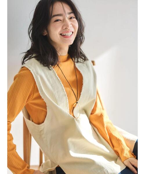 ざっくりと切り込まれたVネックがスタイリングをすっきりとさせるベスト。短めに施されたフリンジで、コーディネートにワンポイントをプラスします。サイドスリットが抜け感のある印象を与えるのもポイント◎シャツやクルーネックのカットソーと合わせた着こなしがおすすめです。透け感[無し] 裏地[無し] 伸縮性[無し] 光沢感[無し] 生地の厚さ[普通] 付属品[無し] ポケット[無し]●製品寸法:F:バスト57 着丈前69/後71 肩幅43.5 裾幅59.5備考:
