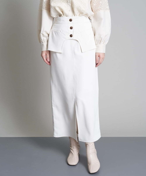 ◆ヒップがレイヤードされたナロースカート◆■デザインヒップの部分が二枚にレイヤードされた仕様。前身頃センタースリット入りで足さばき楽なのも嬉しいポイントの一つです。展開カラーは全2色で、スタイリングを調和するアイボリーと、着回し力に長けたブラックです。どちらのお色味も使いやすく、一枚でアクセントになる優秀アイテムです。■スタイリングセットアップ対応商品の為、合わせるアイテムは(A1JDS04090)のジャケットがおすすめです◎…………………… 透け感:なし 厚さ:普通 伸縮性:なし 裏地:膝位置まであり ……………………
