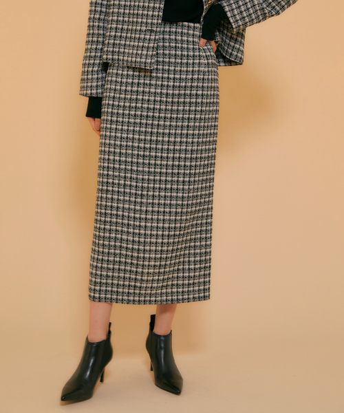 クラシカルなムードのタイトスカートニットとブーツ合わせでクラシカルに。スウェットなどでカジュアルにも着用できます。後ろの金属ファスナーで少し上品な印象に。ウエストとヒップは程よくゆとりがあってトップスをインしやすく、すっきりとしたシルエット。少しハイウエストでスタイルアップして見えます。 同素材のジャケットとセットアップでも着用できます。