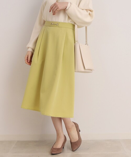 きっちりとしたエレガントなスカートです。 【デザイン】 ベルトラインにビットを付けてワンポイントに! ウエスト後ろはゴム仕様で楽に穿いて頂けます。 タック使いで立体感を出したフレアスカートです。 きれいめブラウスに合わせて通勤には勿論、シンプルなカットソー合わせでデイリーのちょっとしたお出かけにもおすすめ。 ※ポケットなし 【素材】 ポリエステルとレーヨンの混紡生地で、程よくハリと光沢感があり上品な印象の仕上がり。 ストレッチ素材も使用しているのでしっかり感があります。 ※裏地あり モデル情報:身長168cm B76 W58 H86 着用サイズ:02(M) 店舗へのお問い合わせ商品番号:741-76002 ●製品寸法: 02(M):W66~78cm H90cm 総丈70cm 03(L):W68~80cm H94cm 総丈73cm 備考: