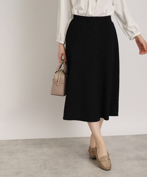 ツイード調生地で上品な大人顔に仕上げたスカート! 【素材】 少しふくらみがあり、あたたかみのあるツイード調カットソー生地です。 ※裏地あり 【デザイン】 ふんわりと広がるフレアなシルエットが、レッグラインをカバーしてくれるうえ、フェミニンな雰囲気をプラス◎ デイリーからフォーマルスタイリングにと、オンオフ問わずに活躍してくれるアイテムです。 ※(741-16304)の同素材トップスとのセットアップもおすすめ。 ※ポケットなし モデル情報:身長160cm B78 W59 H85 着用サイズ:02(M) 店舗へのお問い合わせ商品番号:741-76004 ●製品寸法: 02(M):W67~92cm 総丈72cm 03(L):W70~95cm 総丈74cm 04(LL):W73~98cm 総丈76cm 備考: