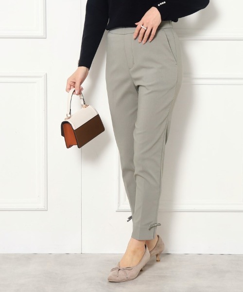 ラクチンな履き心地で、ばっちり綺麗見えするストレッチパンツ♪~POINT~・両脇裾についた華奢な共地のリボンディテールが可愛い細身パンツ・スキニー程ピチピチではなく、程良い細さのシルエットで美脚効果があります・ぐるりウエストゴム仕様ですが、素材の特性を活かし、ゴムギャザーの無いデザインにしているので、ウエスト周りにスッキリ感があり、インナーパンツとしても大活躍します・春らしいギンガムチェック柄から、定番ベーシックなモノトーンカラーまで4色展開!オフィスカジュアルにもオススメです【素材】非常にストレッチ性の高い生地を使用しています。【ディティール・機能】※ポケット数:横×2、後ろ(ダミー)×2※裏地なし【スタッフコメント】・maki(163 )クチュールブローチのストレッチパンツ!今期は細身なリボンが裾にチラ見え♪やり過ぎないフェミニン感が乙女心をくすぐります。ストレッチがとてもよく効いているアイテムなので、ママさんにも◎モデル情報:身長168cm B80 W60 H85 着用サイズ:38(M)店舗へのお問い合わせ商品番号:508-61001●製品寸法:34(SS):W65cm H85cm 股下62cm 前股上21cm 渡り幅27cm36(S):W67cm H87cm 股下62cm 前股上22cm 渡り幅27cm38(M):W70cm H90cm 股下64cm 前股上22cm 渡り幅28cm40(L):W73cm H93cm 股下65cm 前股上23cm 渡り幅29cm42(LL):W76cm H96cm 股下66cm 前股上23cm 渡り幅30cm備考: