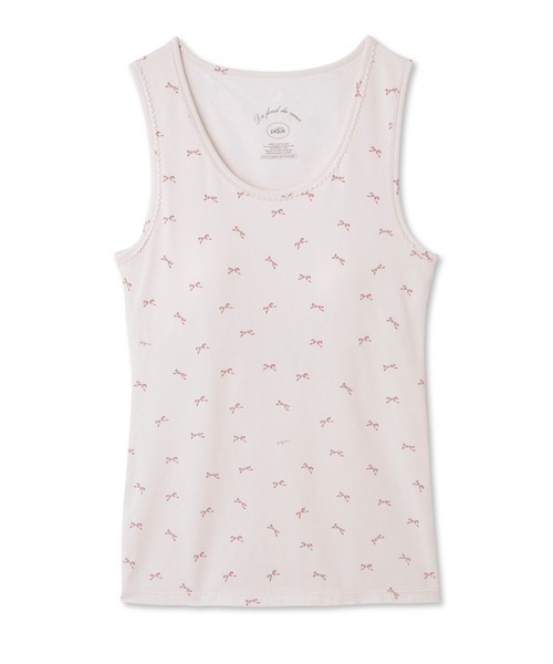 【可憐なリボン柄でガーリーに仕上げたカップインタンクトップ】 【Fabric】 肌触りやわらかく、程よい厚みのあるコットンのカットソー素材を使用しています。 【Design/Styling】 小ぶりの可憐なリボン柄をあしらった、ちょっぴりガーリーなインナーシリーズが登場しました。襟ぐりと袖ぐりに施した繊細なピコミシンがポイントのタンクトップは、カップ付きなので1枚で快適に着られます。首元のネームは、インナーだからこそ肌当たりのやさしさを考慮して、プリントネームを採用しました。色は清潔感あるオフホワイトと淡いピンクの2色。ほかにプルオーバーやレギンスもご用意しています。 ※照明の関係により、実際よりも色味が違って見える場合があります。 またパソコン・スマートフォンなどの環境により、若干製品と画像のカラーが異なる場合もございます。予めご了承ください。 商品の色味は、商品単品画像をご参照下さい。 ※商品画像はサンプルのため、色味やサイズ等の仕様に変更がある場合がございますので、予めご了承ください。