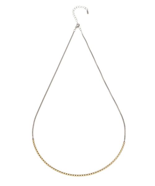 四角いコマのチェーンで、シルバーとゴールドの配色になっているシンプルなデザイン。 線が細すぎない程よいサイズ感のチェーンは、スタイリングのアクセントに。 調節アジャスターがついているので、、首周りに沿わせたり、少し長めにしたりとスタイリングに合わせた長さが調整可能。 ※個人差はありますが、ニッケルフリーメッキでアレルギーが起こりにくい仕様。 ポストはチタン