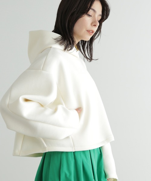 ソフトな風合いのダンボール素材を使用したフードパーカー身頃から続きの袖にして、身幅を大きめに作り、ゆったりとしたシルエットに。着丈は短めなので、今年らしい着こなしを叶えます。袖はやや長めにして、袖口を折り上げると、手先に抜け感がだせるのでオススメ。キレイめで柔らかいダンボール素材なので、デイリーでもカジュアルになり過ぎず、キレイめにもフェミニンモードなアイテムとも合わせて着用いただけます。※撮影時照明の関係により、色味が違って見える場合がございます。またパソコン・スマートフォンなどの環境により、若干製品と画像のカラーが異なる場合もございます。予めご了承ください。商品の色味は、商品単品画像をご参照下さい。※商品画像はサンプルのため、色味やサイズ等の仕様に変更がある場合がございますので、予めご了承ください。