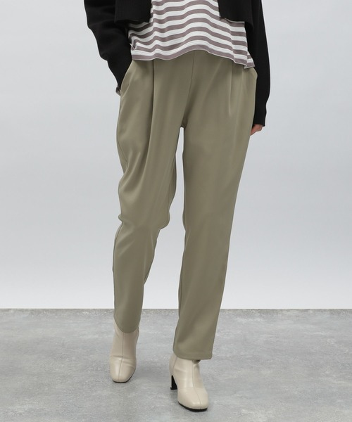 オンオフ問わずにお使いいただける、テーパードパンツ。 ボディラインを拾わず、自然に落ちるシルエットに仕上げています。 ウエストはゴム仕様でラクチンながらも、フラットな前ベルトとタックデザインですっきりキレイな見え感に。 【素材】 なめらかで上品な、微光沢のある生地を使用。 ほどよい厚みで、シワになりにくくお手入れもラクチンです。 【スタイリング】 シャツやブラウスをサラッと合わせたキレイめスタイリングがおすすめ。 トップスはインでもアウトでも合わせやすいデザインです。 また、同素材のジレやジャケットと合わせれば、セットアップのスタイルもお楽しみいただけます。 ▼同素材のトップスはこちら ショールカラーロングジレブランド品番:184001 ZOZO商品コード:72154677 ダブルブレストジャケット ブランド品番:184002 ZOZO商品コード:72154678