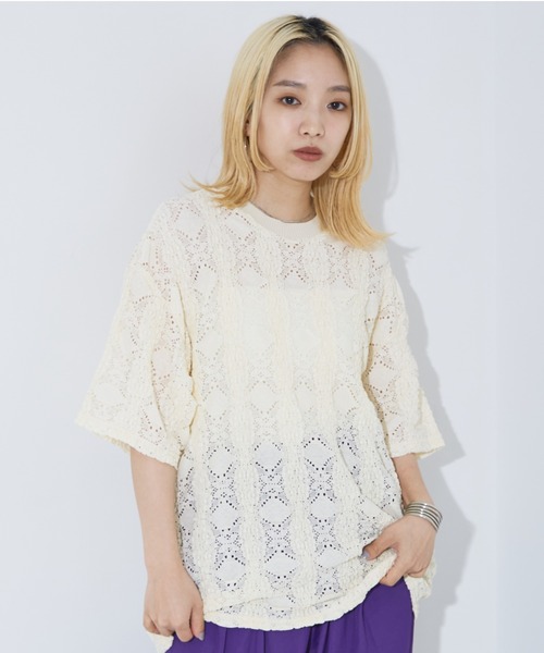 人気アイテムに新色クリームが登場! -Design- 伸縮性のあるカットレースを使用したTシャツはシンプルだけどNOMINEのこだわりが光る1枚で主役感のある逸品。 -Detail- カタチはシンプルにTシャツ型に襟ぐりはニットでリブを作り特別感を。 レースでかわいくなりすぎない表面感のある素材で他とは違った大人らしい着こなしに導くアイテムです。 -Cordinate- パンツやスカート、アイテムを選ばずコーディネートに取り入れやすいアイテム。 中のインナーで見え方を変えるのも着こなしポイント。 【Attention】 大人気により追加が決定! 追加はホワイト1、グレー1、ブラック1で、多少素材の変更があり、柄は同じですが、よりレース感のわかりやすい素材となっています。 ホワイト、チャコールグレー、ブラック→同素材 ホワイト1、グレー1、ブラック1→→同素材 ホワイト モデル:H156 着用サイズ:Fブラック モデル:H162 B77 W60 H86 着用サイズ:F