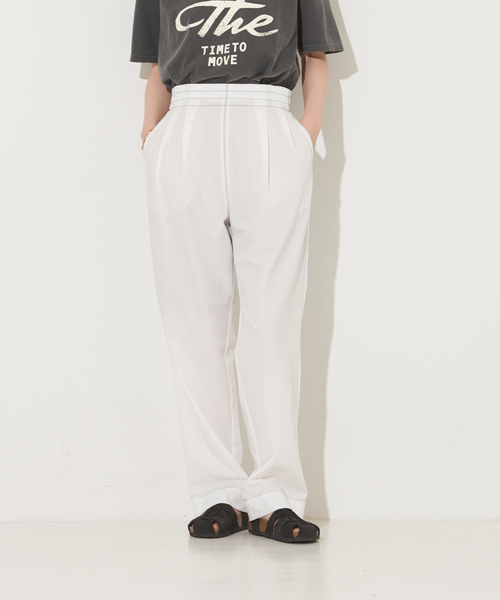 -Design-昨年も人気のタックパンツがブラッシュアップされて登場。 配色ステッチがポイントになりシンプルながらデザインのきいた一枚に。フロントはすっきりとしたウエストまわりのハイウエストパンツ。 ゆったりとしたシルエットがこなれた感じに見えてどんなコーデにも合わせやすい万能アイテム。 -Detail- ハイウエストだけど後ろベルトがゴムで履きやすい仕様。 さらりとした素材感で着心地も抜群。ホワイトは透けにくいベージュの裏地付になっています。 -Cordinate- きれいめにもカジュアルにも振れるアイテム。 Tシャツと合わせてもかっこよくスタイルアップ。 ヒールのあるものはもちろん、足元はサンダルやスニーカーとさらりと合せるのがオススメ。 ホワイト モデル:H162 B77 W60 H86 着用サイズ:S
