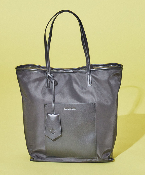 フロントに大きなポケットがついたトートバッグ。 A4サイズも楽に入る大きさでマチも広く、仕事・プライベート様々なシーンで活躍するシンプルなデザイン。 全体に柔らかく馴染みの良いキャンバスとナイロン素材を使用し、エコレザーのアウトポケットには 「CONVERSE TOKYO」のロゴ入り。ペットボトル(500ml)も立てて入れられる仕様で水筒や哺乳瓶にも対応可能。 人気のギャザートート同様、ロゴ入りキーチャームも付きます。