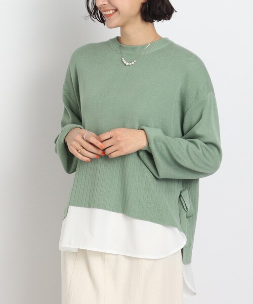 【デザイン】 ニットプルオーバーと裾ラウンドシャツのドッキングタイプで一枚なのに重ね着をしたように見えるニット。 サイドのリボンもアクセントに。 着丈に前後差があるので、パンツはもちろん、スカート合わせでゆったりリラックス感のある着こなしもおすすめです。 【素材】 伸縮性が高く、ちくちくしないなめらかな生地です。 ※こちらの商品は少し網目が粗いため、お手持ちのインナーを合わせて頂くのがお勧めです。 マシンウォッシャブルOKでお手入れ簡単! モデル情報:身長168cm B76 W58 H86 着用サイズ:00(FREE) 店舗へのお問い合わせ商品番号:C62-16303 ●製品寸法: 00(FREE):着丈71cm B118cm 袖丈52cm 肩幅51cm 備考: