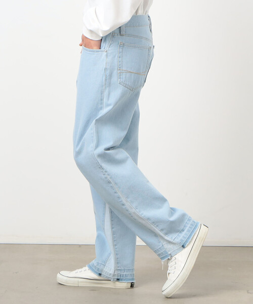【素材】10オンスの程よく厚みのあるデニムです。しっかりとした丈夫さがあり、重たくなりすぎない肉感で、季節を問わず通年で快適に着ていただけるのが魅力です。【デザイン】脚の両サイドに切り替えを入れたデニムパンツです。シルエットは腰回りに程よくゆとりがあり、裾までまっすぐに仕上げた太めストレートです。切り替え部分はデニムの裏側を使いポイントにしています。裾は一度ミシンで縫い上げて、ウォッシュ加工をした後にステッチをほどいたリメイク風デザインです。シンプルなコーディネートのアクセントとしても映えるこだわりの一着です。裏地:無し伸縮性:無し光沢感:無し生地の厚み:普通レディースにもおすすめです。レディースモデル(H166 B82 W59 H84 着用サイズ:S)♯ユニセックス♯ジェンダーレス※画像の商品はサンプルとなりますので実際の商品と仕様、加工、サイズが若干異なる場合がございます。※こちらの商品はFIVE FOXes独自の採寸方法となっています。本サイトのサイズガイドと採寸方法が異なる場合がありますのでご了承ください。