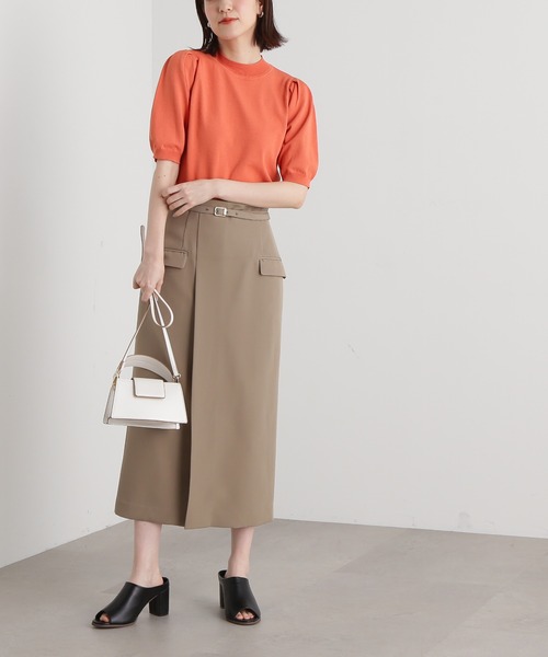 Iラインをキレイに見せるラップ風タイトスカート。細めの共布ベルトでウエストマークができるので、きちんと見えも叶えます。タイトなラップ風デザインに、裾はベンツ(スリット)をいれ足さばきも良く仕上げています。ブラウスやニットまでオンオフで着用いただけます。**********************透け感:なし裏地:あり伸縮性:ややあり光沢感:なし生地の厚さ:普通**********************