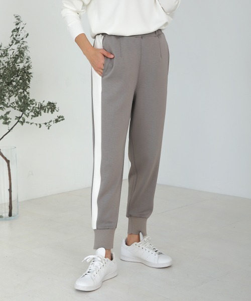 サイドラインが細みえ効果抜群!スタイルアップが叶うジョガーパンツ ■POINT 履くだけで旬のスタイルが完成するラインジョガーパンツ。 スポーティなデザインながらスフレスムースの柔らかく少し光沢のある上品な素材感で、普段使いしやすい仕様に。 サイドに入った太めのラインが脚のラインをキレイに魅せてくれ 裾部分もリブになっており、全体的にたるまずにシャープに着用できるので カジュアルになりすぎないところがポイントです。 ■FABRIC 伸びのいい素材で、さらっとした履き心地がとても気持ちいい。 ■COORDINATE スポーティーなシルエットなのでスニーカーとはもちろん、あえてヒールを合わせて大人っぽいコーデに仕上げることで周りと差がつくスタイリングに。 ヒールを合わせるときは上品なブラウスなど女性らしいアイテムを持ってくると、全体のバランスもよくなります。 同素材のトップスと合わせるとセットアップのように着用できるのでセットでも別々でもおススメです♪ ………………… 裏地:なし 透け感:なし ポケット:あり 伸縮性:あり 生地の厚さ:ふつう ………………… ★商品のお気に入り登録 登録すると、完売しても再入荷時に通知を受け取ることができます。 ほかにもお得な特典があるかもしれません♪ ★ブランドのお気に入り登録 新商品や再入荷などの情報を受け取ることができますので、是非ご登録ください♪