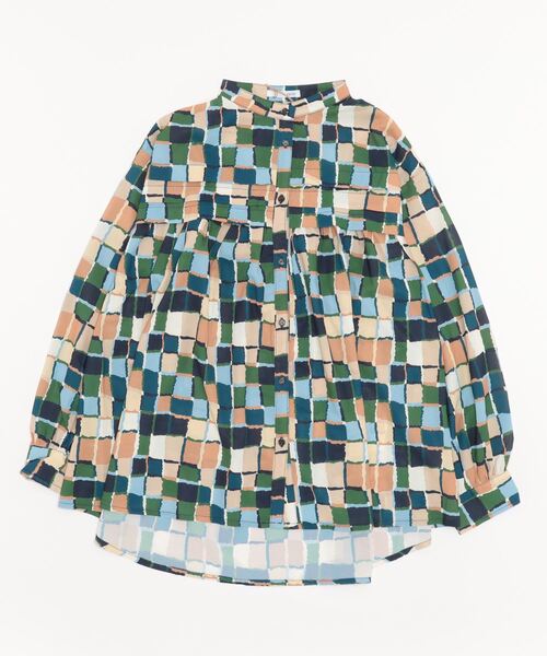 モザイク柄とパズル柄、2種類のプリント地を使用した、クルーネックブラウス。フロントにタックとギャザーを入れた細やかなデザイン。ゆったりしたサイズ感と、少し長めの着丈が体型カバーにぴったり。落ち着いた色味で可愛らしくなりすぎない、大人可愛いアイテムです。