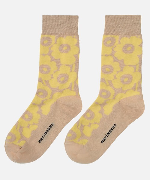 『Marimekko Kioski』 マリメッコのアイコン的プリントを再解釈し、無限のワードローブを提案するジェンダーニュートラルなストリートウェア Marimekko Kioski(マリメッコ キオスキ)。「他人の真似はせず、自分らしく」をキーワードに、作り物ではないオーセンティックなスタイルを追求したコレクション。【テキスタイルデザイン:Maija Isola(マイヤ・イソラ)】 Unikko(ウニッコ):けしの花Marimekkoを代表するUnikko(ウニッコ)柄のショート丈ソックス。全面にあしらわれたケシの花のモチーフ柄が華やかなデザイン。いつもの着こなしにプラスして、アクセントを与えてくれるアイテム。履き口はずれにくいリブ仕様。スタイリングになじみやすいツートーンカラー。毎日のスタイリングで活躍します。《サイズ》※サイズは目安です。参考までにご覧ください。34(34-36):22.0-23.0cm37(37-39):23.5-24.5cm40(40-42):25.0-26.0cm43(43-45):26.5-27.5cm46(46-48):28.0-29.0cm