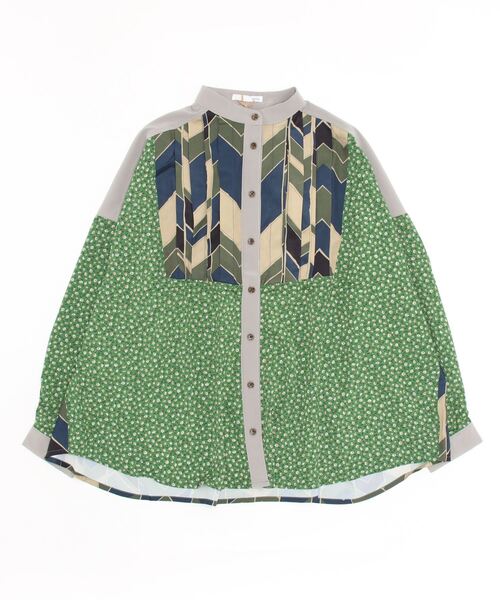 2種類のプリント生地の組み合わせが新鮮なスタンドカラーシャツ。コーディネイトのアクセントになるカラフルな色合いが魅力的。シャツがメインのコーディネートはもちろん、ニットやカーディガンのインナーにもぴったりなアイテム。トップスイン/アウトどちらもバランス良く着ていただけます。