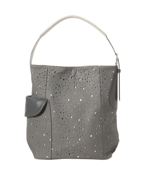 -2023 Spring Summer COLLECTION-【デザイン】FORATA(フォラータ)…穴あき不協和音の美を表現した穴あき革、穴から覗く爽やかな白、そこに無限の輪をモチーフに考えたディティールを組み込み、インフィニティに財布とバッグを楽しめるようにという祈りを込めてデザインしました。お出かけにちょうどよいサイズで、通勤にも休日にもお使いいただけます。肩にかけても、手に持ってもバランスがよく、ハンドルはお好みに合わせて長さ調整をしていただけます。ポケット数:外側×2/内側×3【素材】クロムフリーでなめしたやぎ革にレーザーで穴をあけ、洗いをかけたあとに染色しています。モデル情報:身長168cm B76 W58 H86店舗へのお問い合わせ商品番号:709-06535●製品寸法:00(FREE):高さ32cm 幅(上部)28cm 幅(下部)27cm マチ9.5cm 持ち手上がり13~17cm備考:重量:約660g(サンプル重量)