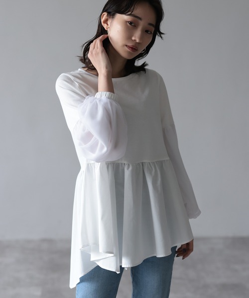 ♦ 2023 PRE SPRING COLLECTION ♦ 異素材ドッキングのデザインながらカジュアルすぎない上品なトップス ●今年らしいふんわりとしたチュールドッキングボリュームスリーブ。 ●後ろにかけてやや長くなっている裾ペプラム。 ●裾ペプラム異素材は動くたびに揺れるふんわりとしたブロード素材。 ●細身〜ストレートシルエットのボトムとの相性◎ ◆COLOR◆ ホワイト : 柔らかな印象の爽やかなホワイト。 プラム : 発色の良い顔写りの綺麗なプラム。 ブラック : モード感のある上品なブラック。 ◆MATERIAL◆ 表地はコットン100%の目の詰まった天竺素材を使用。 袖のチュール素材は柔らかでチクチクしない素材。 チュールの下には柔らかなシフォン素材が重なっており透けすぎない仕様に。 ペプラム部分は柔らかいブロード素材を使用。 歩くたび揺れる軽さです。 ■お手入れ方法:手洗い ※お取扱いについては、商品についております品質表示にてご確認ください。 ■透け感: あり〇〇〇〇●なし(本体生地) ■生地の厚さ:厚い 〇〇〇●〇 薄い(本体生地) ■裏地: なし ■伸縮性: あり(本体・チュールのみ) ■光沢感: なし ※光の具合で色味が違って見える場合があります。 ★もっとお買い物を楽しむために★ ★商品のお気に入り登録 お気に入り登録した商品は、セールの通知、ラスト1点の通知、完売カラーの再入荷通知などを受け取ることができます。 ★ブランドのお気に入り登録 新商品の発売や再入荷、タイムセールの通知など、HERENCIA取扱いブランドのお得な情報を受け取ることができます。