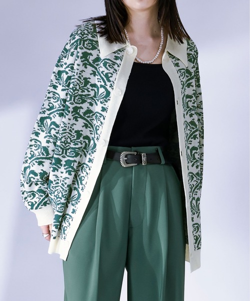 "モードを軸にするジェンダーレスブランド" 1枚で主役級のダマスク柄ニットカーディガン。 さらモチな風合いで春まで着やすいニット 袖は程よいバルーンシルエットに襟は配色の襟付きでメリハリをプラスされデザイン性の高いアイテム。 ルーズに着れるのでこれからの時期シャツと合わせるのもおすすめです。 羽織るだけで一気に存在感を放ちモードな印象に。 ボタンを閉めてプルオーバーとしても活躍できるアイテム。 ブラック×オフホワイト オフホワイト×グリーン の配色の2色展開です。 ■おすすめスタイリングアイテム■ 180706 ロングボウタイ付きバンドカラーシャツ 298281 美脚カラーフレアパンツ ----------------------------------------------------------------- EllnoLoset_officialインスタグラムでも商品情報を見て頂けます。 毎週金曜日18:00~インスタライブで新作アイテムをご紹介。 ----------------------------------------------------------------- クールなモノトーンと 今の気分をMIXしたモードブランド。 ジェンダーレスで何にも縛られない 自分の為に着る媚びないファッションを提案します。 ----------------------------------------------------------------- ▼商品のお気に入り登録 完売カラーの再入荷通知や、ラスト1点、セールの通知をお知らせ致します。 ▼ブランドお気に入り登録 新商品や再入荷など、いち早くブランドの情報を受け取ることができます。 ※サイトに表示されているカラー名と実際のお届け商品に記載されているカラー名が異なる場合がございます。