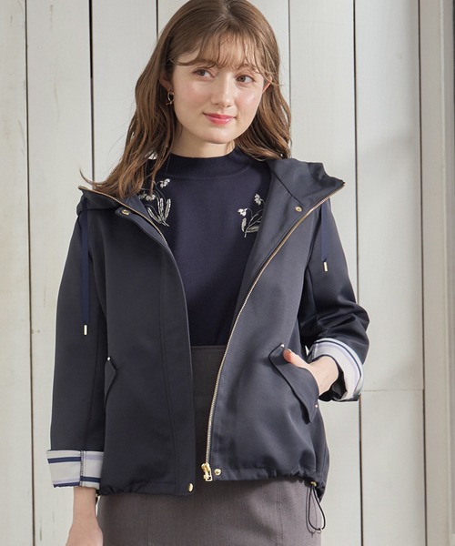 ◆上品見えマウンテンパーカー◆ ロングセラーのきれいめマウンテンパーカーです。 素材は程よいツヤ感のあるグログラン生地を使用しており、 上品さがあり、オンオフ着回ししていただける素材感です。 シワにもなりにくく、風を通しにくい素材なので、 春秋の季節の変わり目の気温感にちょうど良い一枚です。 裾はドロスト仕様で丸みのあるフォルムにしてフェミニンな着こなしも楽しめます◎ 裏地のマルチボーダーがポイントで、袖口を折って見せても抜け感のある着こなしをしていただけます。 カジュアルながらもゴールドのパーツが上品さを演出してくれるので、 デニム合わせはもちろん、スカートとのきれいめスタイルにもおすすめです。 ◇手洗い可能