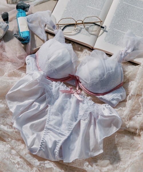 ブラジャーのカップやストラップまでチュールレースをたっぷり使ってガーリーで甘さ満載のセットブラ♪ カップ下のサテンテープがアクセントになっていてバストを優しく包み込みます。 セットのショーツもフリルになっていて更に気分を上げてくれること間違いなし♪ D75 E75 F75はセットショーツLサイズ