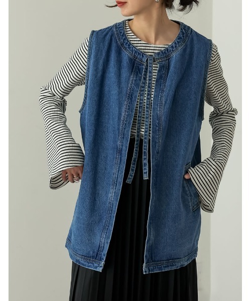 さっと羽織るだけで旬な雰囲気が叶うデニムジレ カジュアルにもモードにも着こなせるデニムジレが登場。 程よく身幅にゆとりのあるシルエットで、シアーインナーやリブカットソー、Tシャツなど様々なトップスに合わせていただけます。 フロントのリボンは結んだり、さっと垂らしたり、お好みの着こなしに。 しっかりとした程よく厚みのあるデニム生地で、大人の洗練された印象に。 シンプルなスタイリングに、さっと羽織るだけでも旬な雰囲気をプラス。 程よいカジュアルさが魅力のジレジャケットです。 素材・着用感 しっかりとしたコットンデニム生地 ▼お取り扱いについて ※素材の特性上、水分や汗、摩擦などにより色落ちすることがございます。ご着用やお洗濯の際には十分ご注意ください。 ■モデル着用写真は撮影環境により、 多少実際のカラーと異なる場合がございます。 お気に入りショップにご登録いただきますと、 ショップニュースを、いち早くお届けいたします。