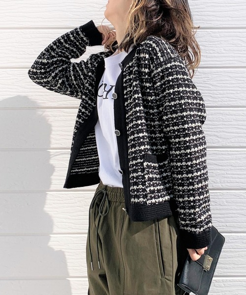 ジャケットよりも気兼ねなく羽織れるツイード風カーディガンです。キレイめにもカジュアルにも着用でき、合わせるボトムでコーディネートの幅の広がります。ほんのりラメが入っており、上品に見えるのも◎寒い時期はアウターを上に着て、春は軽アウターとして活躍しそうな1着です。《インフォメーション》◆商品のお気に入り登録完売していても再入荷時に再入荷通知を受け取ることができますので、是非ご登録ください。◆ブランドのお気に入り登録新商品や再入荷などの情報を受け取ることができますので、是非ご登録ください。