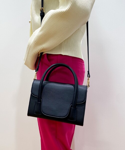 アンバランスなハンドルがポイントのミニバッグ。【デザイン】少しアンバランスに配した長めのハンドルデザインが魅力のミニバッグ。かぶせの形もハンドルに合わせてカッティングをしています。コンパクトな見た目ながらマチもしっかりあるので、携帯・ミニウォレットは収納頂けます。取り外し可能なロングショルダーで斜め掛けでもお使い頂けます。※ポケット数:内側×1【素材】上品な印象の細かな凹凸のある表面感のフェイクレザーを使用しています。シックなブラック・クリーンなホワイト・さわやかなブルーの3色展開です。店舗へのお問い合わせ商品番号:C71-16017●製品寸法:00:高さ15cm 幅(上部)20.5cm 幅(下部)21cm マチ6cm 持ち手上がり6.5cm 付属ショルダー対応サイズ106.5~120.5cm備考:重量:約305g(サンプル重量)