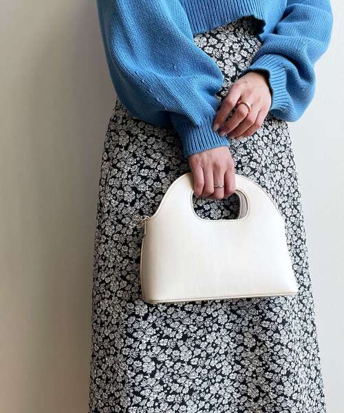 くりぬいたようなハンドルデザインがポイントのミニバッグ。【デザイン】丸みのある本体をくりぬいたようなハンドルデザインが魅力のミニバッグ。コンパクトな見た目ながらマチもしっかりあるので、携帯・ミニウォレットを収納頂けます。取り外し可能なロングショルダーで斜め掛けでもお使い頂けます。※ポケット数:内側×1【素材】ツヤのある表面感のフェイクレザーを使用しています。シックなブラック・クリーンなホワイト・華やかなピンクの3色展開です。店舗へのお問い合わせ商品番号:C71-16020●製品寸法:00:高さ12.5cm 幅(上部)21cm 幅(下部)23cm マチ8.5cm 持ち手上がり5cm 付属ショルダー全長110cm備考:重量:約265g(サンプル重量)