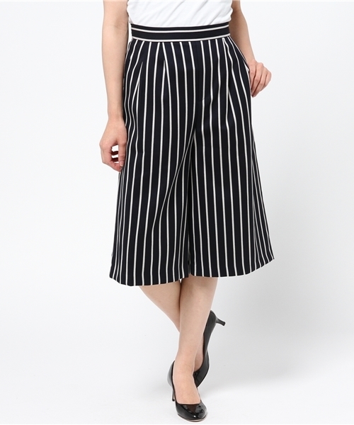 2015年も抑えておきたいミモレ丈(ミディ丈)アイテム。ストライプを施したデザインはメンズライクが今年らしさを引き立たせます。トレンドの柄でありつつ、縦のラインを強調してくれるストライプはワイドなシルエットながらも美脚を演出してくれる優れもの。ヒールはもちろん、バレエシューズやスリッポンといったカジュアルシューズと合わせた爽やかなコーディネートもお似合いです。【メイン画像】スタッフ身長:163センチ 着用サイズ:38【詳細画像】スタッフ身長154センチ 着用サイズ:36