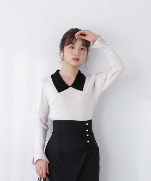 【商品特徴】バイカラーの衿がポイントのニットプルオーバー。 袖部分のゴールドボタンが、 手元に華やかさをプラスしてくれます。 大人っぽく着ていただけるように拘った配色の衿やデザインは、 オフィスシーンにもオススメ。 【スタイリング】 スカートにINをするとバランス良く見えるコーディネートが完成します。 <商品のお気に入り登録> お気に入りアイテムの値下げ・再入荷・在庫1点などの通知を受け取ることができる 便利機能ですので気に入ったアイテムはお気に入り登録がおすすめ! <ショップのお気に入り登録> 新商品や再入荷、セール、クーポン配布などお得な情報を受け取ることができます。 ●撮影はサンプル商品で行っている為、仕様とサイズが異なる場合がございます。 ●スタジオ及び屋外で撮影した着用画像は、光の当たり具合で色味が違って見える場合があります。予めご了承ください。