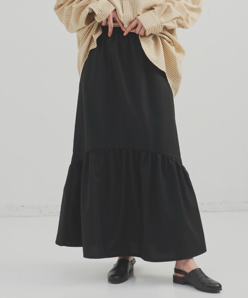 ラウンドヘムデザインがポイントのティアードスカート■ポイント・ラウンドの切り替え・きれいになびくティアードデザイン・ウエストゴム・ひざ丈の裏地付き……………………透け感 : なし厚さ:普通伸縮性:なしお手入れ方法:手洗い推奨……………………■デザイン/素材ナイロンのような少しシャカシャカとした素材。ティアード切替部分はラウンドしており遊び心をプラス。ウエストはオールゴムできれいに楽に着用していただけます。■スタイリングすっきり見えのスカートなのでゆったりとしたトップスとのコーディネートがおすすめ。ゆったりニットやオーバーサイズのシャツをアウトスタイルで◎素材的にカジュアルにもきれいにもできるのでスタイリングの幅が広がります。※ご注意※・屋外の光や照明の当たり具合で、実際の商品の色味とカラー別画像の色味に若干の違いが発生する場合がございます。・詳細画像と併せてご確認の上、ご注文いただきますようお願い致します。【merlot】#カワイイハオモシロイカワイイを自分らしく楽しむ女性へユーモア&ハッピーそしてちょっぴりモードに大人の休日にとびっきり可愛くなれるお洋服を提案【商品のお気に入り登録】完売カラーの再入荷通知やラスト1点の通知、プライスダウンの通知を受け取ることが出来ます。【ブランドのお気に入り登録】新商品や再入荷など、嬉しい情報を受け取る事が出来ます。ぜひご登録ください◎
