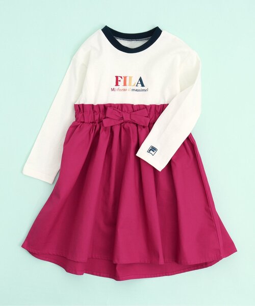 【FILA×apres les cours】 ロゴ刺繍の入ったリンガーTシャツと長めのスカートを合わせたドッキングワンピース。 スカートには前後差がついていて前は膝くらい、後ろは膝下くらいの丈感になっています。 ウエストの大きめリボンとぱきっと鮮やかな色合いが目を惹くワンピースはデイリーにもおでかけにもおすすめ♪ 同じくロゴを刺繍したTシャツもあるので合わせてチェックしてくださいね!