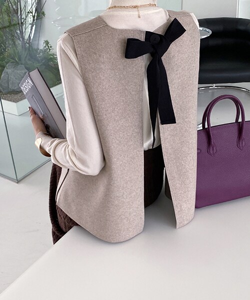 [COMMENT]首後ろの配色リボンが可愛らしいベストです。ボタンを留めて結ぶだけなので着脱楽ちん♪バックラインは深いスリットで窮屈感なく、フロントはサイドのフェイクボタンがアクセントに。ラウンドネックでもたつきもありません。ウールブレンドの季節感ある一着です。パフスリーブアイテムに合わせるとムードUP? ※パターン、ボタンの位置にずれが生じる場合がございます。