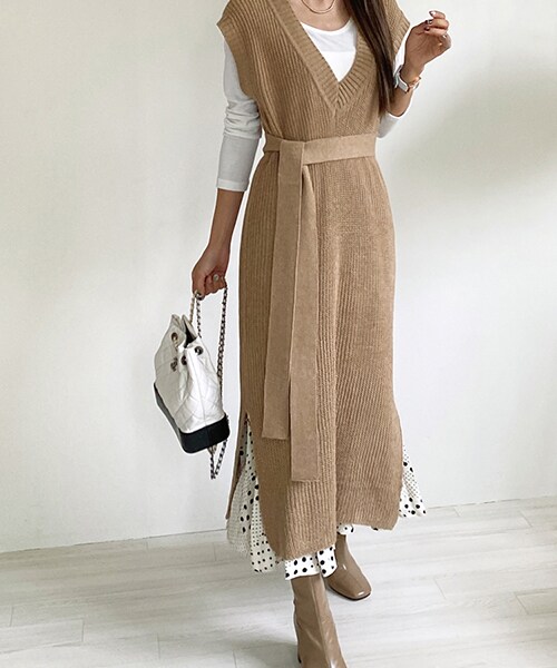 [DESIGN]付属のワイドストラップで演出を変えられるやわらかいニットベストです。Vネックのロング丈がトレンディ。ワンピースのように着用いただけます。裾サイドにはスリットで抜け感を+。肩をやや覆うフレンチスリーブが女性らしくシャツやブラウスとレイヤードして自由にお洒落を楽しめるアイテムです♪※素材の特性上、ドライクリーニングをお奨めします。※明るい色味は透け感が気になる場合があります。スキントーンの下着とお召しいただくと安心です。