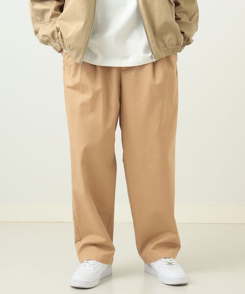 古着ライクなトレンドアイテム ■デザイン 人気の〈KANGOL(カンゴール)〉コラボから、トラディショナルな雰囲気の2タックチノパンツが登場。太もも部分のワンポイントや腰裏の配したロゴテープなど、随所にこだわりを散りばめました。当時の雰囲気はそのままに、現代風にアレンジした旬のアイテムです。 ■コーディネート ゆったりとしたストリートスタイルとの相性は抜群。古着と合わせた90年代風の着こなしもおすすめです。 ■サイズ ウェストはイージー仕様で、ベルトレスで着用可能。 ■素材 コットン100%のベーシックなチノクロスを採用。穿き込むことでより風合いが増していく、しっかりとした生地感が魅力です。 Model:H176 Size:L SIZE Model:H182 Size:L SIZE Model:H180 Size:L SIZE ※商品の色味は白背景商品単体で撮影した画像をご参照ください。 ※屋外撮影による光の当たり具合やパソコンなどの閲覧環境によって、実際の色味と異なって見える場合がございます。予めご了承ください。