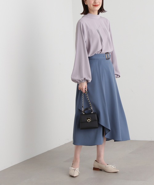 裾にアシンメトリーの切り替えを施したフレアスカート。ヘムラインのアシンメトリーデザインが歩くと揺れ動き、足元を軽やかに見せてくれます。共布ベルトでウエストマークができるので、ニットやカットソーなどをインするとスタイルアップ見えを叶えます。