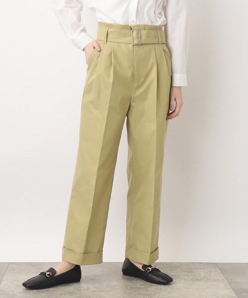 【デザイン】 ワークパンツをきれいめに女性らしく落とし込んだベルテッドパンツ。 ウエストは幅太の共布ベルトをセット。 ウエスト位置を高く見せ、女性らしいシルエットバランスに。 センタープレスにほんのりとテーパードしたシルエットも、脚をすっきり見せさせるポイントです。 裾はダブルの仕様にして、アクセントをつけています。 足首がほっそり見えする効果も◎ ※ポケット数:横×2、後ろ×2 【素材】 まるで綿のような光沢がきれいなツイル素材を使用。 カジュアルさ上品さを併せ持った素材です。 ほどよいハリ感があるので、身体から離れて脚のラインをすっきり見せてくれます。 ※裏地なし 【スタイリング】 あえてカジュアルなカーキとチノベージュの2色展開。 今季はレディライクで上品なツイードジャケットやベスト、フリルディティールのアイテムとカジュアルボトムをスタイリングするのがおすすめです。 カーゴパンツ程カジュアルさが無いデザインにまとめているので、チャレンジしやすいアイテムに仕上がりました。 足元はバレエシューズやフラットシューズ、パンプスで足の甲を見せた抜け感ある合わせがおすすめです! モデル情報:身長166cm B80 W59 H86 着用サイズ:02(M) 店舗へのお問い合わせ商品番号:768-66021 ●製品寸法: 01(S):W69~79cm H102cm 股下64cm 前股上33cm 02(M):W72~82cm H105cm 股下65cm 前股上33cm 03(L):W75~85cm H108cm 股下66cm 前股上33cm 04(LL):W78~88cm H111cm 股下67cm 前股上34cm 05(3L):W82~92cm H115cm 股下67cm 前股上34cm 備考: