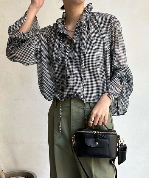 ■2023 SPRING & SUMMER ITEM■ フリルデザインが新鮮味をプラス! シアー感のある素材で春夏らしく仕上げたフリルブラウス。 首元・袖口をフリルにデザインし、首元にはリボンのデザインをプラス。 首元をざっくりと開けて、甘くなり過ぎないよう、抜け感をだした着こなしがおすすめ。 1枚ではもちろん羽織りアイテムやスウェットなどとレイヤードして、いつものスタイルに新鮮なアクセントをプラスするなど着こなしも様々ですよ! - POINT - ・シアー感のある素材がシーズンムード満載 ・首元のボタンはざっくり開けるのがおすすめ! ・1枚でもレイヤードでも◎ -------------------------------- 洗濯:手洗い可能 透け感: あり 裏地: なし 伸縮性: なし 光沢感: なし -------------------------------- 【 ♡ をクリックでお得な情報をお知らせいたします 】 〈 商品のお気に入り登録 〉 お気に入りアイテムのお値下げ・再入荷・在庫ラスト1点など通知を受けることができます。 〈 ブランドのお気に入り登録 〉 DOUDOUの新商品や再入荷、セール、クーポン配布などお得な情報を受けることができます。 -------------------------------------- ※ 生産の都合上、お届け時期が前後する場合がございます。 ※ 掲載画像の商品の色味は、 撮影場所や光の当たり具合などにより色味が異なって見える場合がございます。 また、お客様のお使いのPC・スマートフォン等のモニター環境などにより色味が異なって見える場合がございます。予めご了承の上ご注文ください。 ※ 着用、お取り扱いの際は、商品についている品質表示とアテンションタグを必ずご確認下さい。