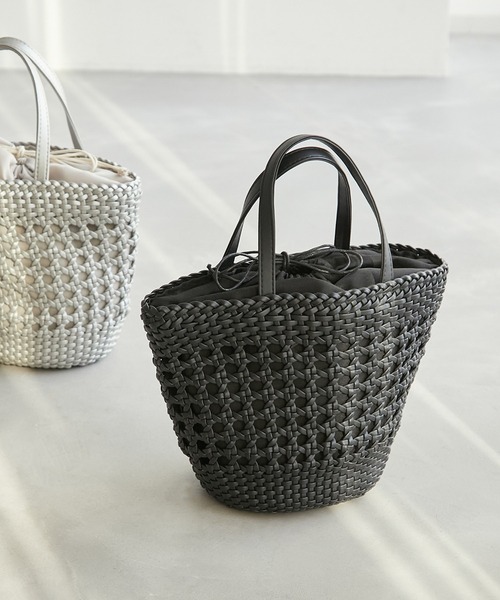 大人が持てるスタイリッシュなバケットトート。 【デザイン・シルエット】 ・メッシュ編みのバケットトートバッグ。 ・荷物をガードできる、安心の巾着袋付き(巾着はバッグ本体にくっ付いています)。 【カラー】 ・ブラック、シルバーのクールな2色を展開。 【スタイリングポイント】 ・きれいめなトレンチコートスタイルにぴったり。 ・シャツ×ジーンズの洗練されたコーディネートにプラスして。 ----------------------------- ポケットの数:中1個 A4収納:不可能 長財布収納:可能 ショルダー紐:なし ----------------------------- ※撮影時の光、お使いのモニター環境によって色の見え方が違う場合がございます。 ※縦10cm×横20cm×マチ1.2cmの長財布(何も入っていない状態)で計測しております。
