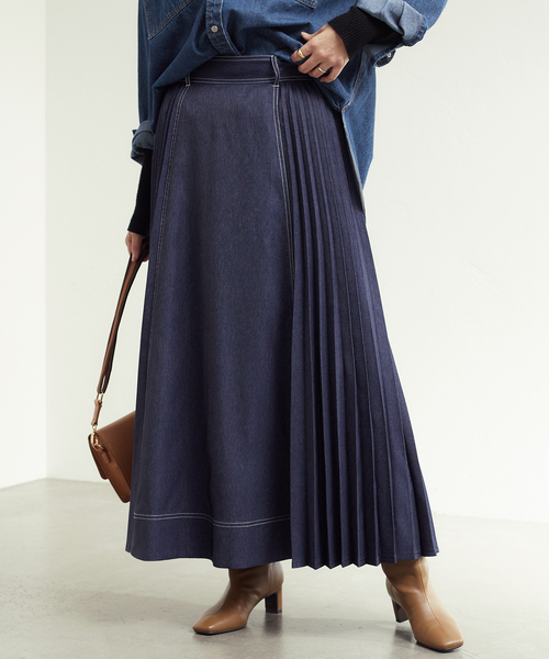 【2023SS】B.C STOCKデニムライクな見え感のポリエステル素材を使用したプリーツスカート。重い印象になり過ぎない様にフロント中心部分はフラットなデザインにし、フロント接ぎから後ろにかけてアコーディオンプリーツを入れました。ステッチワークが効いて程よいカジュアル感があり、真夏を除くロングシーズンご着用いただけるアイテムです。冬物ニットとスタイリングしても、春物トップスと合わせて先見せスタイリングも可能なスカート。ご自宅で手洗い可能なイージーケアも嬉しいポイントです。**********************透け感:なし裏地:なし伸縮性:なし光沢感:なし生地の厚さ:普通**********************【スタッフ着用コメント】《スタッフasako》年齢:30代前半/身長:153cm/体型:普通/普段サイズ: S~M/着用サイズ :フリーサイズ感:ウエストは後ろがゴムになっているので、やや伸縮の幅があります。サイドジップで着脱しやすい仕様。低身長な私では、やや丈感は長めでした。素材感:軽い素材感で、歩くたびに揺れるプリーツが可愛いです。裏地はなく、透け感もありませんでした。着心地:動きやすく、着心地の良い一着。硬くなく、比較的柔らかい素材なので、オールシーズン着られるようなアイテムです。**********************※取り扱いについては、商品についている品質表示でご確認ください。・洗濯 本体:手洗い可・この製品はプリーツ加工を施してありますが、永久的なものではありません。 ・この製品は色あせしますので、光の当たらない場所で乾かしたり、保管してください。・単独で洗ってください。 ・この製品はデリケートな素材です。 洗濯の際は部分的なつまみ洗いや、もみ洗いはせず、軽く押し洗いしてください。 脱水は軽く手絞りか、タオルに挟んで水分を取り、形を整えて日陰に干してください。 (ニットなど型崩れの恐れがあるものは平干ししてください。) ・生成や淡色製品は、白くなったり、色ムラになることがありますので、蛍光増白剤配合洗剤は使用しないでください。※照明の関係により、実際よりも色味が違って見える場合があります。またパソコン・スマートフォンなどの環境により、若干製品と画像のカラーが異なる場合もございます。※商品の色味は、商品アップ画像をご参照ください。モデルサイズ:H165 着用サイズ:フリー本体:手洗い可能