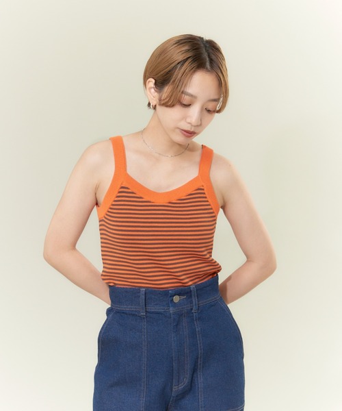 -Design-ニットアイテムとしては珍しい胸パッド入りのニットタンクトップ。さらっとした麻タッチの糸で着心地も伸縮性も抜群。インナーとしてはもちろん、1枚でも着れる大活躍なアイテムです。-Detail-細ピッチのボーダー、無地、無地配色の3パターンをご用意。レトロが今季のトレンドでもあるので配色が今年っぽい仕様。何枚持っていても間違いなしの、この春夏の必需品に。-Cordinate-インナーとしてはもちろんのこと、一枚でデニムやスカートとさらりと合せてヘルシーに着るのがオススメ。オレンジ モデル:H156 着用サイズ:F