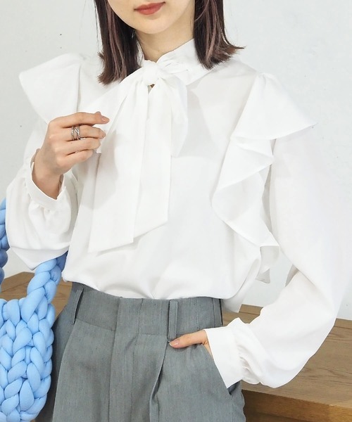 ラッフルデザインが華やかなボウタイリボンブラウスです。きちんと感のあるボウタイ襟を今っぽくボリューミーな大きさにすることで、上品なカフス袖と好バランスになるよう仕上げました。肩周りのラッフルデザインが女性らしさをさらにプラスしてくれます。すっきりとしたデニムやスラックスと合わせて大人っぽく、ミニ丈のボトムでトレンドライクに着こなすのがオススメです。※実店舗と発売時期が異なることがございます。あらかじめ御了承ください。※撮影場所やお使いのモニター環境により若干お色味が異なる場合がございます。※お取り扱いに関しましては、商品に付属のアテンションタグをご覧ください。※サイト上のカラー名と、お届け商品に記載されているカラー名が異なる場合がございます。※生産時期により色・素材・サイズ感など多少異なる場合がございます。予めご了承ください。サイズ身幅【50cm】肩幅【38cm】総丈【58cm】そで丈【52cm】※こちらの商品はワンサイズのみとなります。【お買い物をより楽しんで頂くために】▼商品のお気に入り登録♡のクリックで商品のお気に入り登録が完了!完売カラー再入荷のお知らせ、ラスト1点のお知らせ、セールのお知らせを受け取ることができます。▼ブランドのお気に入り登録新商品や再入荷のお知らせ等、いち早くブランドのお得な情報を受け取ることができます。