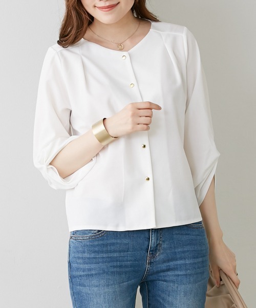 【Be praised】ーーー明日ちょっと褒められる服ーーー大人トレンドを意識したこだわりのアイテムと着こなしでアナタの毎日に輝きを。ただシンプルできれいなだけじゃ物足りない。カジュアルすぎず、スタイリッシュで大人の品性を感じる着こなしに。そんな、こなれたオシャレを楽しむ女性に寄り添う、 新鮮なリアルクローズをご提案します。【ONにもOFFにも着回せるカットソーブラウス】■デザイン・1枚で着映えるトップス・華やかな印象を与える袖口タックデザイン・大人の抜け感を演出するVネック・手首の見える短めの袖丈、ロングシーズン着用可■素材・細やかなシボ感のあるカットジョーゼット生地・伸縮性があり着心地快適・洗濯機洗いOKでお手入れ簡単■おすすめのスタイリング・きれいめのスカートやパンツを合わせたオフィススタイル・デニムと合わせた大人のカジュアルスタイル<仕様>ポリエステル100%(カットソー)透け感:ややあり ※オフホワイトのみ伸縮性:あり生地の厚み:普通光沢感:なし裏地:なし季節:春・秋シルエット:普通<洗濯方法>洗濯機OK ネット使用■キーワード春、トップス、ブラウス、カットソー、オフィス、オフィスカジュアル、カジュアル、大人カジュアル、きれいめ、キレカジ、シンプル、着回し、抜け感、20代、30代、40代、Vネック、オンオフ兼用、UVカット、洗える素材、オンオフ兼用、きれいめカジュアル、大人カジュアル、ボタン、デザイン、レディース、ファッション、オンオフ兼用、きちんと感、通勤服、