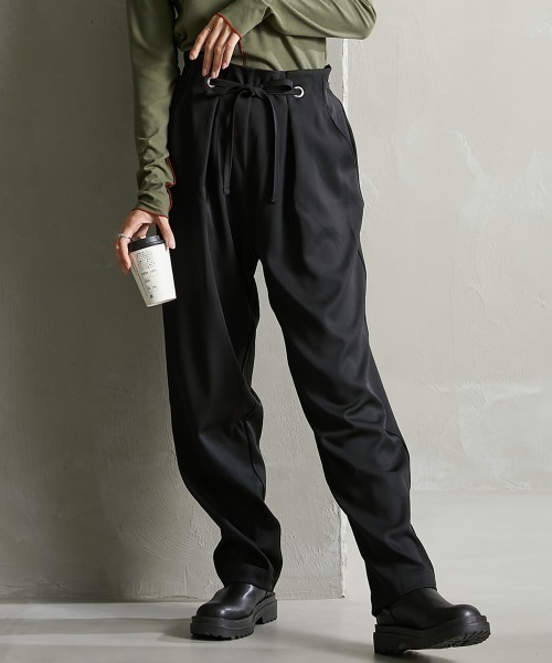 【Soiunique/スワユニーク】唯一無二のアナタへ――― カジュアル×モードスタイルをベースに、 ストレスフリーなサイズ設計で どこかに”抜け感”と”格好よさ”を感じさせる商品をご提案。 体型カバーやスタイルアップも叶えつつ、 コンプレックスを個性にして自分のスタイルを貫く唯一無二のアナタへ。 ■商品特徴 ウエスト細見えのハトメタックパンツ! 光沢感のある上品な素材で高見えしてくれて、 ウエスト部分のハトメデザインが個性的な印象に仕上げてくれて、 調節可能なウエスト紐で自由自在な着用感演出! さらっと着れて、大人感まで出してくれる万能アイテムです。 <仕様> 品質=ポリエステル96%・ポリウレタン4%(織物) <洗濯方法> 手洗い ■キーワード カジュアル,スワ,スワユニーク,モード,レディース,レディースファッション,冬,ウエストデザイン, ハトメタック,タックパンツ,ハトメ,ゆったり,テーパード,ストレートパンツ,体型カバー,春