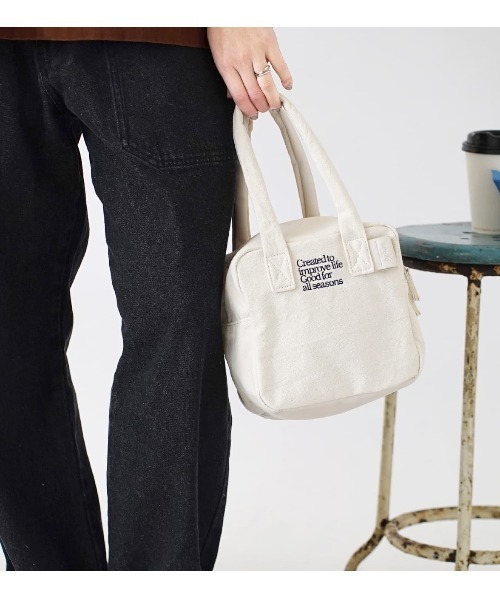 ころんとしたシルエット サイコロのようなスクエアシルエットが可愛いミニボストンバッグ。 カジュアルになりすぎず、どんなシーンでもお使いいただけます。 やわらかくあたたかみのあるコットンキャンバス素材を使用した、シンプルかつベーシックなシリーズ。 持ち手部分のやわらかな合皮素材や、ロゴ刺繍がポイントです。 マチがしっかりあるのでランチバッグとしても。