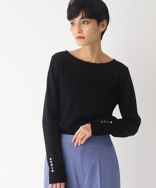 【My style is...掲載】 スリーブの釦デザインがポイントの総針編みニットプルオーバー ------------------------------------------------- ▼ お気に入り登録 1000人突破!------------------------------------------------- 【デザイン】 ・袖口のボタン使いと、さりげないスリットデザインがポイントのニットプルオーバー ・さらりとしたドライ感と落ち感のある風合いながら、程よい肉感のある糸のニットなので、張り付きすぎず着やすい一枚。 ・春らしいボーダーカラー(オフホワイト/303)は一枚でスタイリングの主役にも、キャミワンピースやジャケットのインナーにもおすすめです。 【素材】 ・コットン(綿)/レーヨン/シルク混紡糸の素材で、オールシーズン着用可能なドライなタッチと、柔らかな着心地。 ・ファインゲージの糸を総針編みにすることで、クリーンな表面感でキレイ目な印象に。 ・ご家庭での洗濯機でのお洗濯が可能です。 ※マシンウォッシャブル ※こちらの商品はやや透け感があるため、インナーの着用をおすすめします。 こちらの商品は主に春に着用いただける商品です。 モデル情報:身長165cm B72 W57 H84 着用サイズ:38(M) 店舗へのお問い合わせ商品番号:637-16015 ●製品寸法: 36(S):着丈56cm B80cm 袖丈57cm 肩幅30cm 38(M):着丈57cm B84cm 袖丈58cm 肩幅32cm 40(L):着丈58cm B88cm 袖丈59cm 肩幅34cm 42(LL):着丈59cm B94cm 袖丈61cm 肩幅37cm 備考: